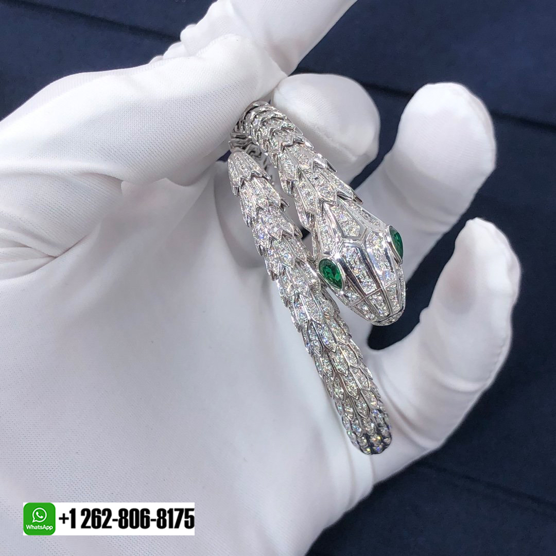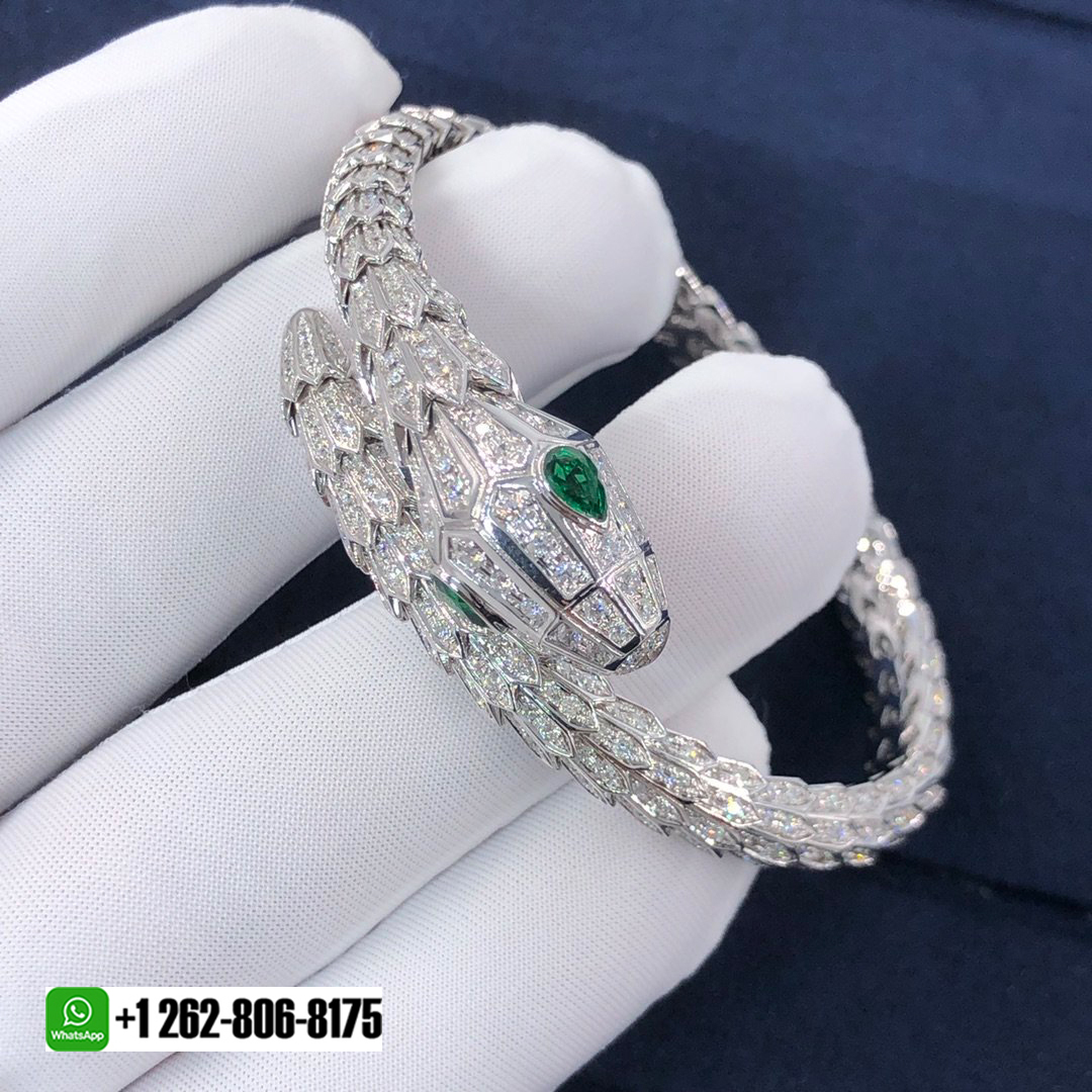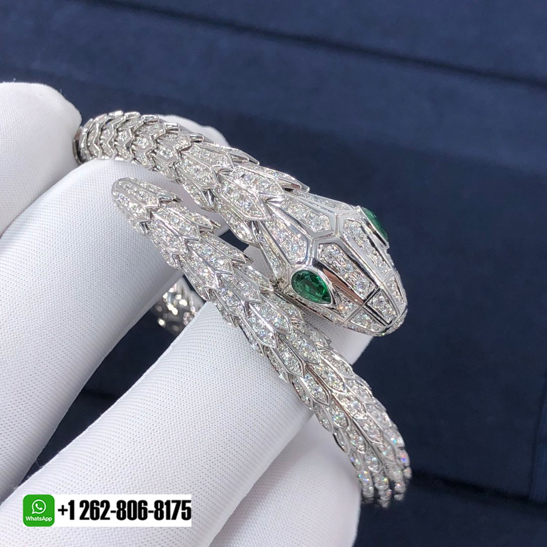 Serpenti’ coil bracelet set with round brilliant-cut diamonds and pear-shaped emerald eyes,18K white gold, signed Bulgari and numbered.
