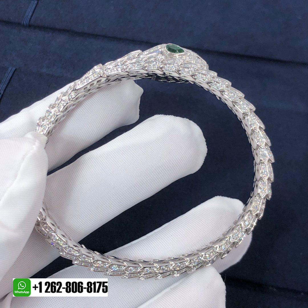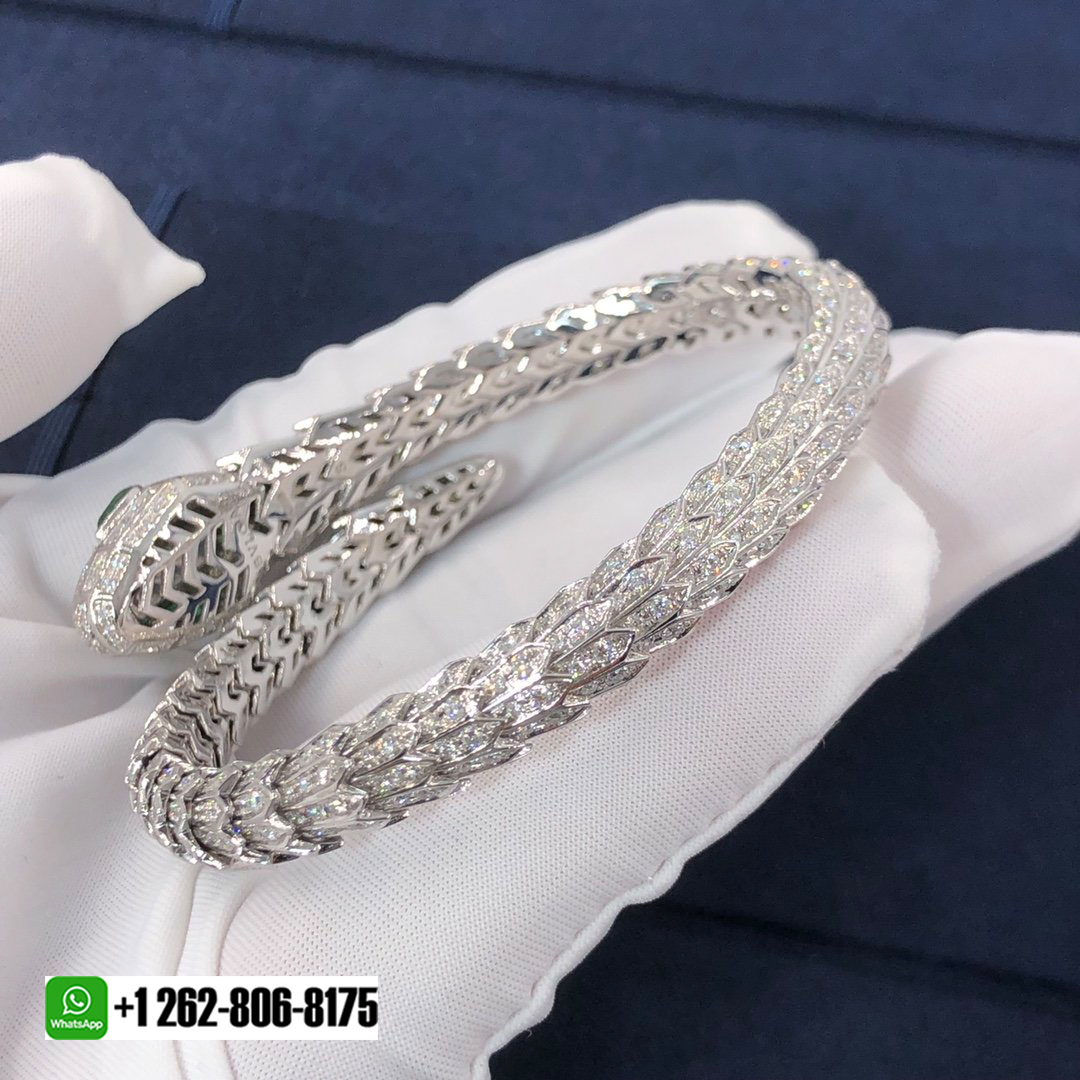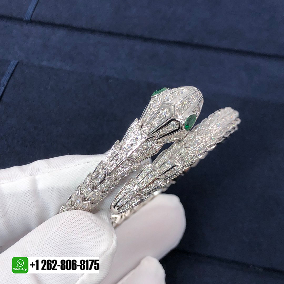 Serpenti’ coil bracelet set with round brilliant-cut diamonds and pear-shaped emerald eyes,18K white gold, signed Bulgari and numbered.