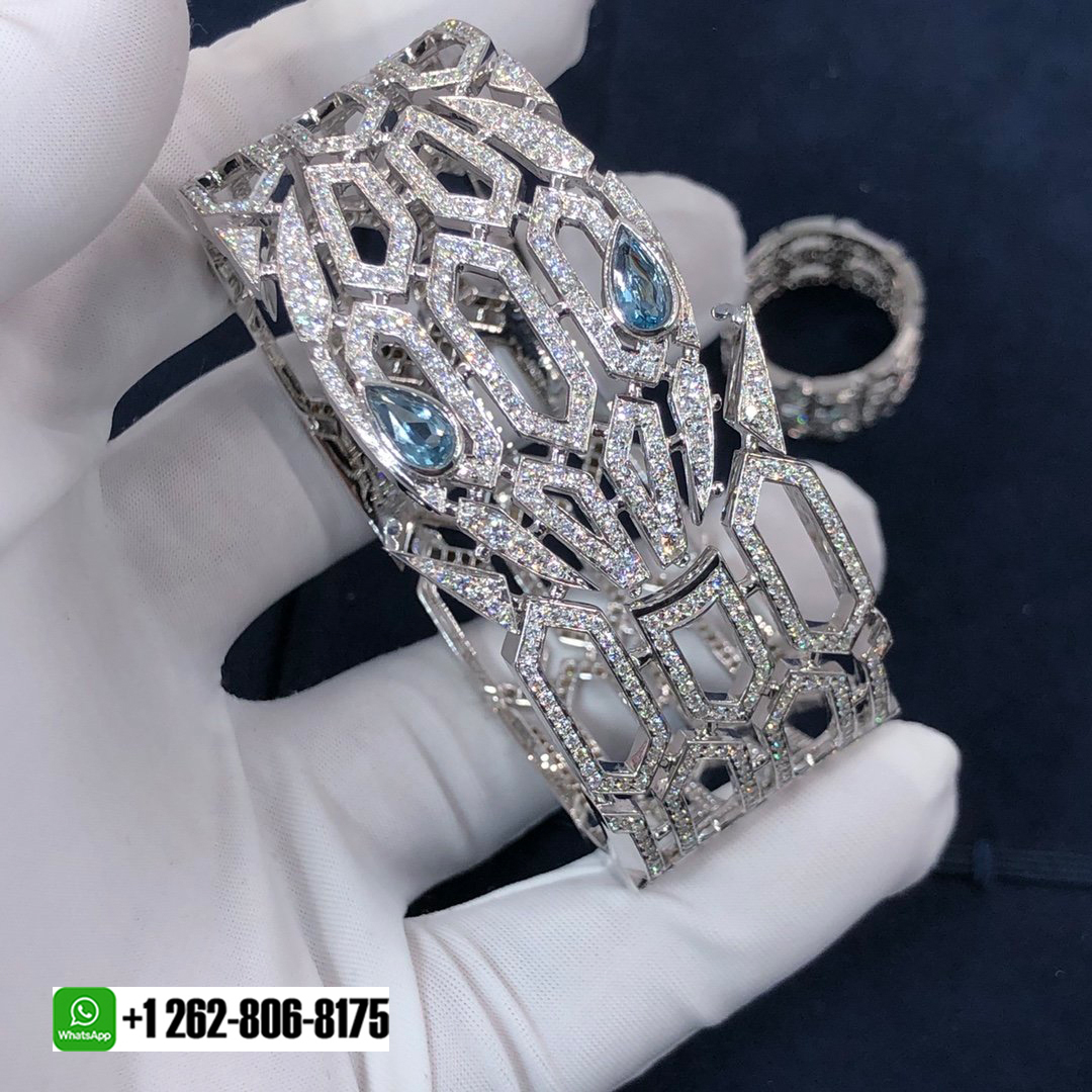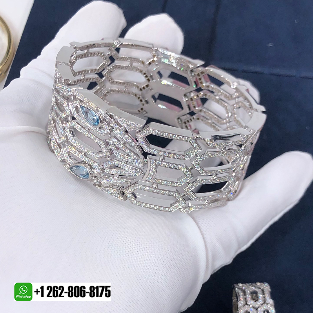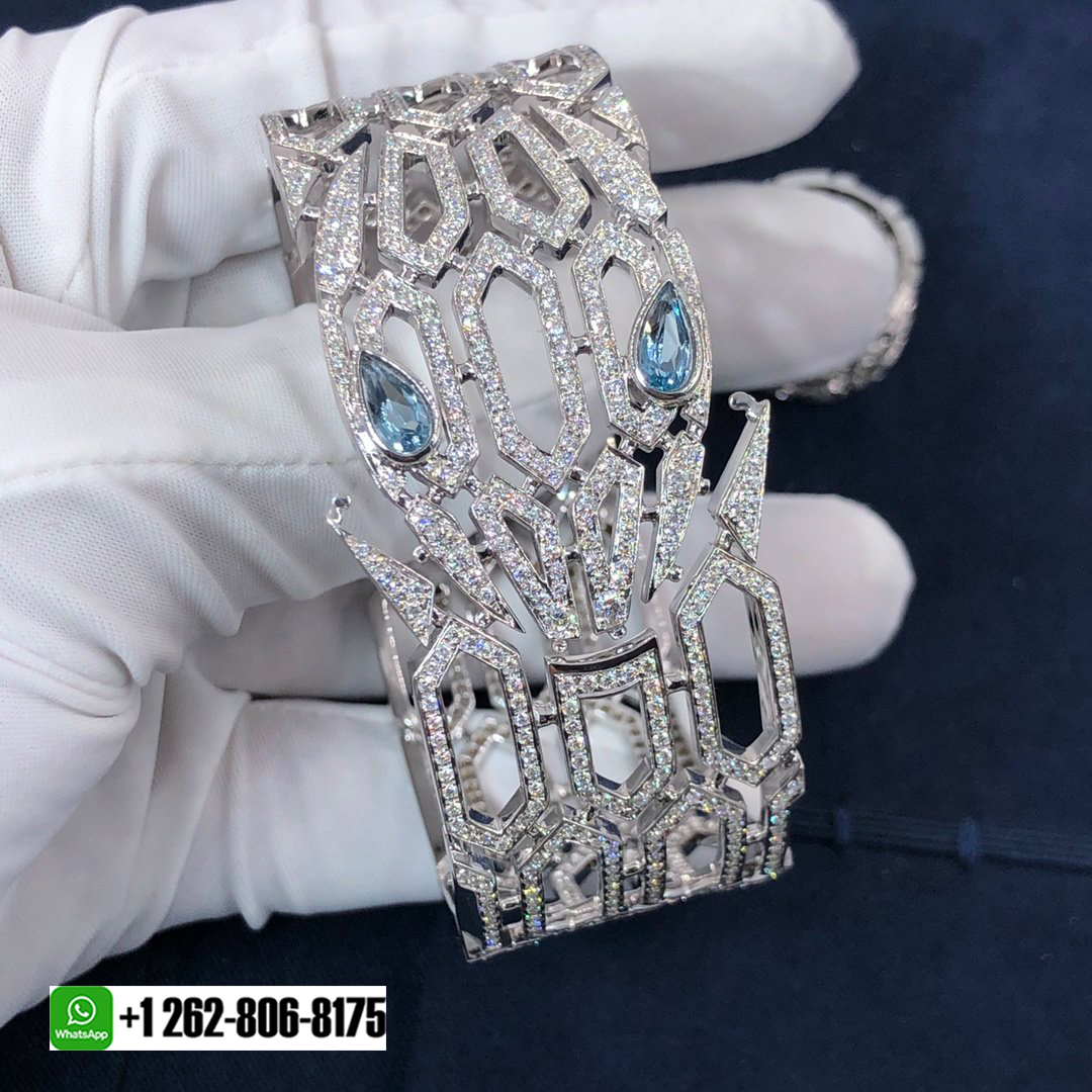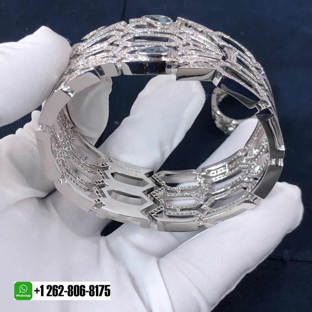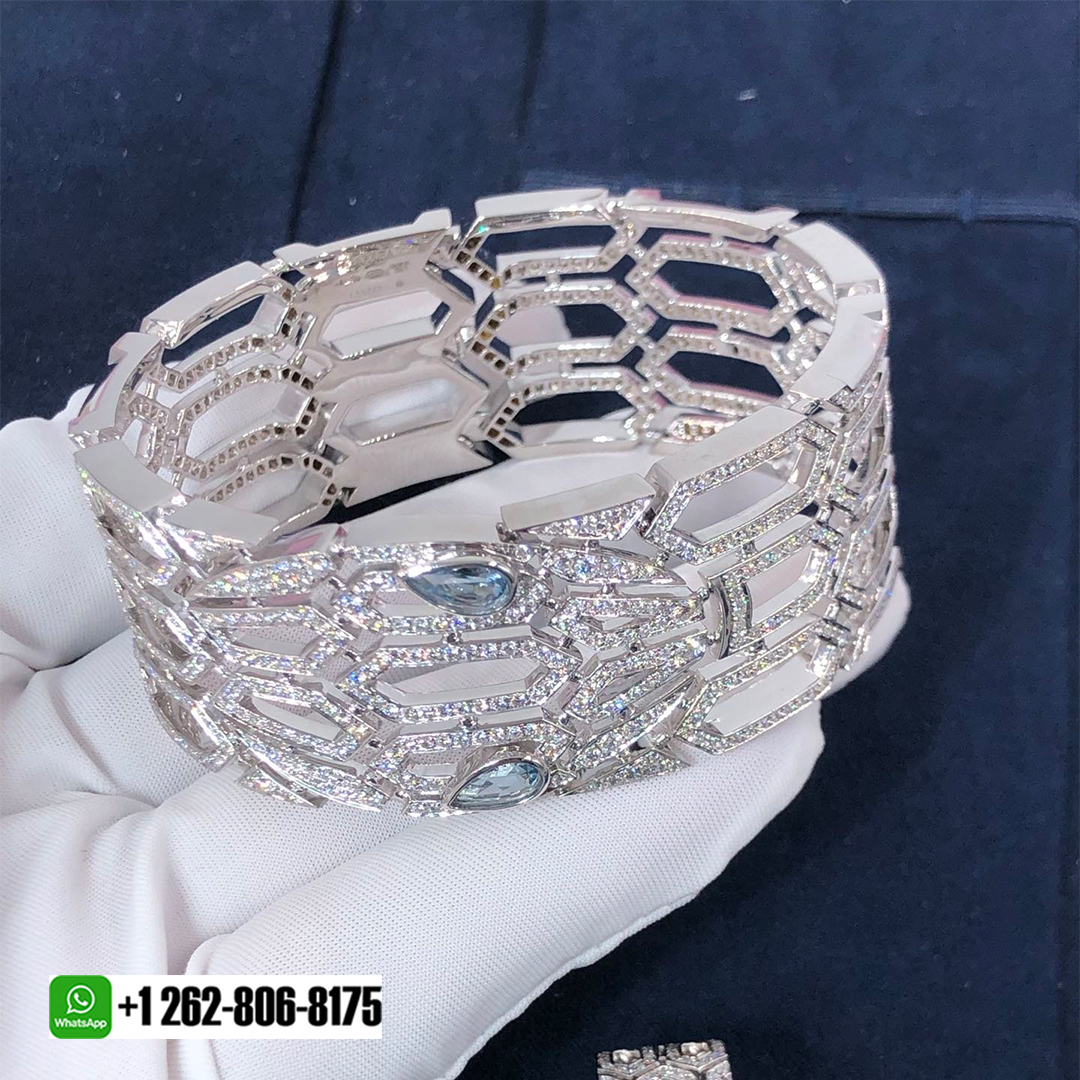Serpenti bangle bracelet in 18 kt white gold, set with aquarine eyes and full pavé diamonds.