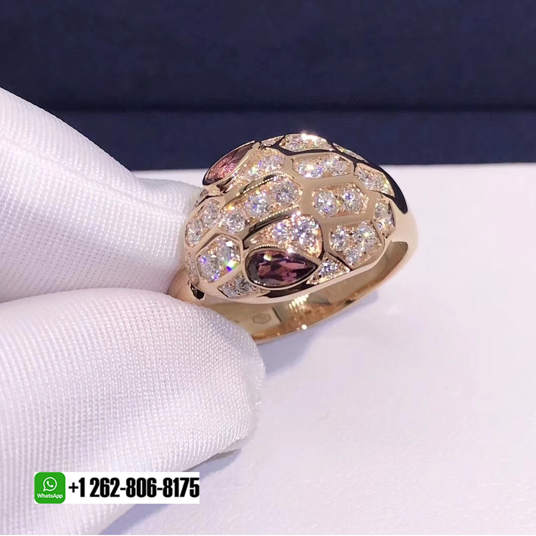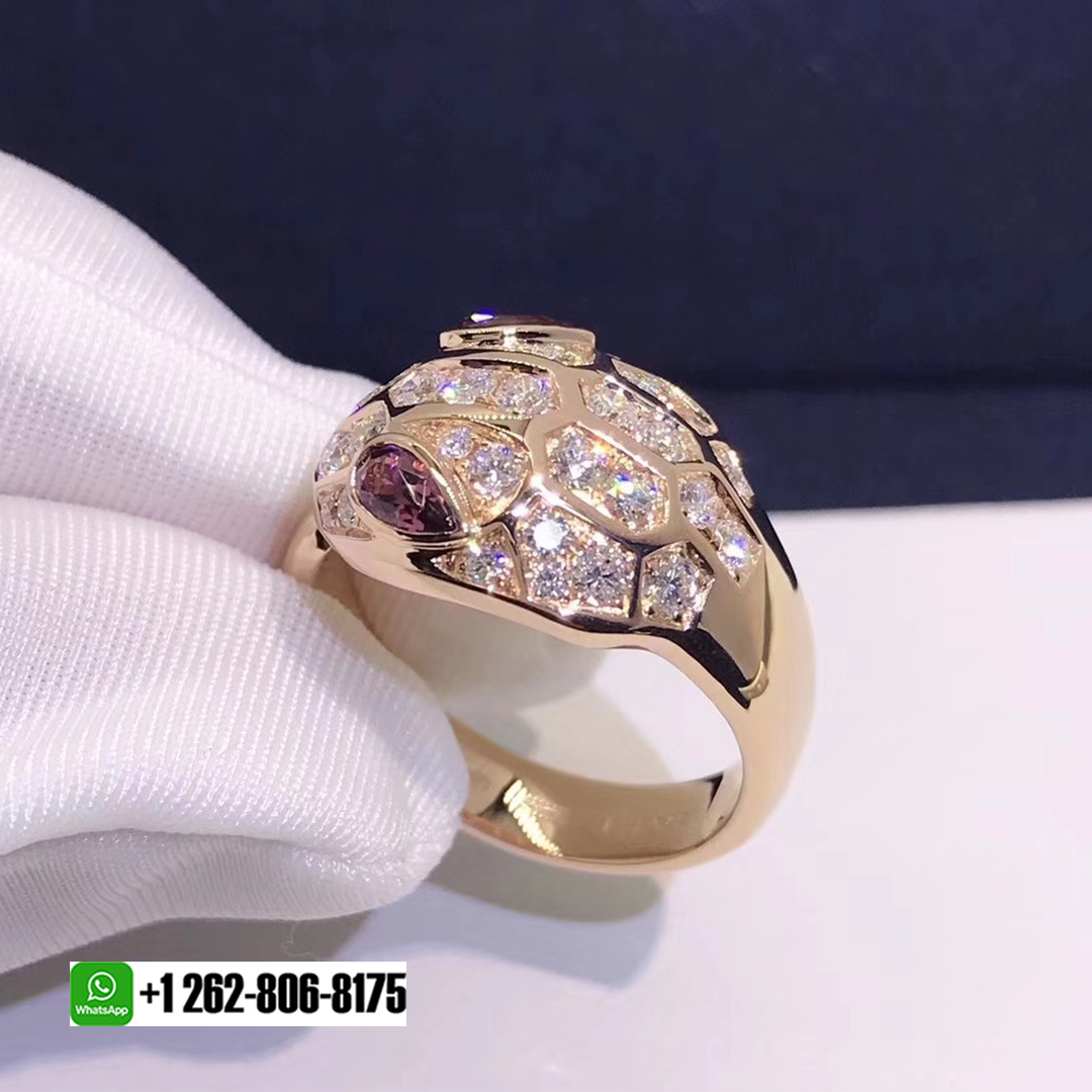 Serpenti ring in 18 kt rose gold, set with rubellite eyes and full pavé diamonds.