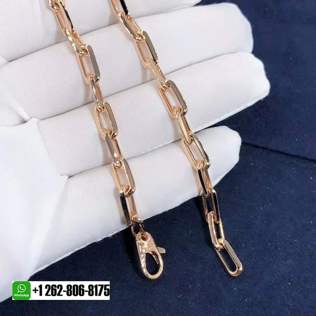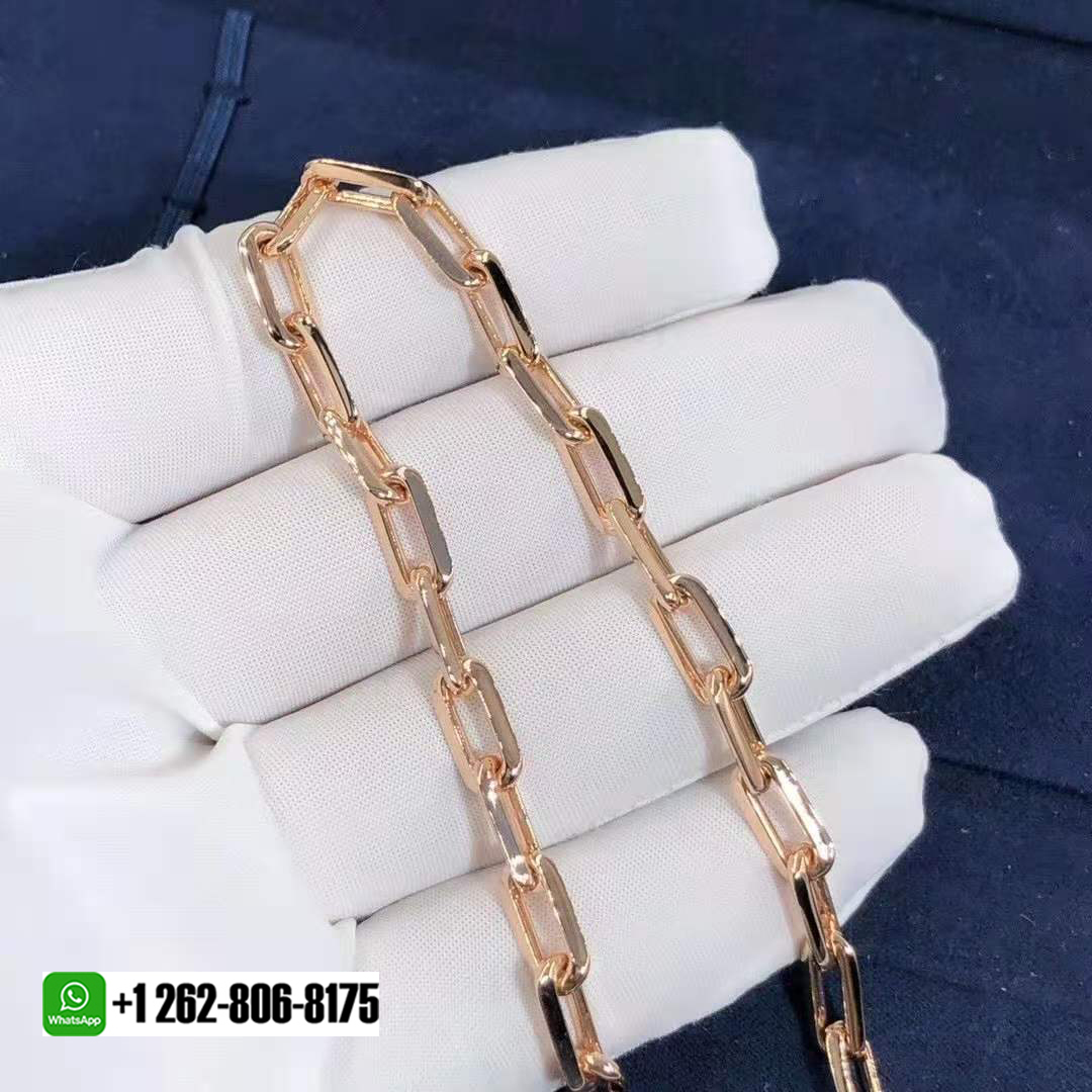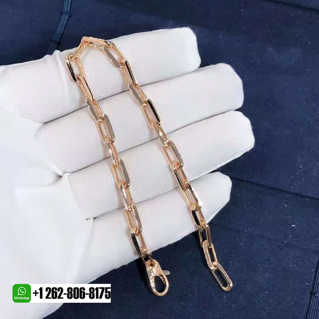 This lovely ‘Santos de Cartier’ chain bracelet is crafted in 18 carat pink gold. It is formed by interlocking chain links and measures 7 inches long. It closes with a claw clasp and all original Cartier makers marks are present.