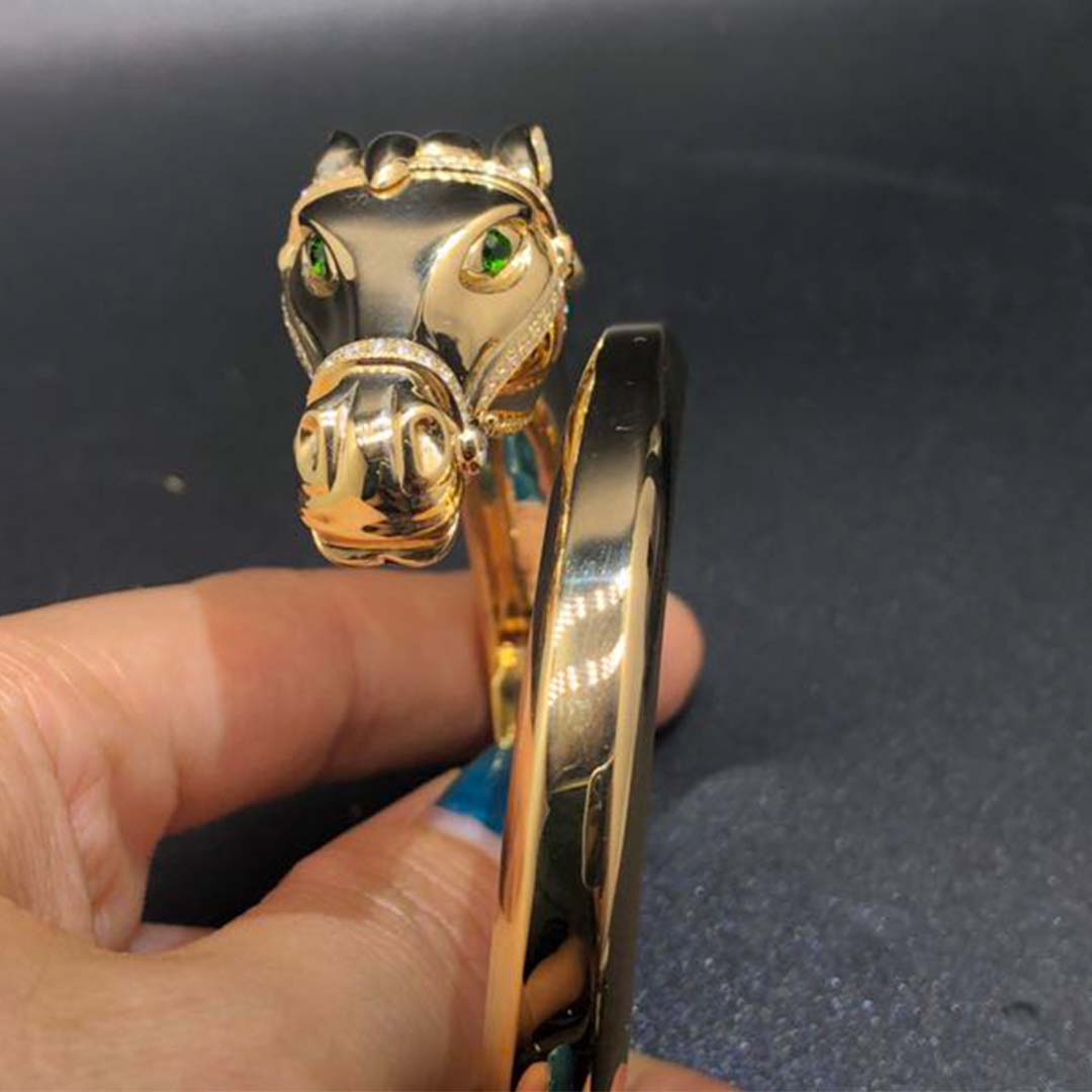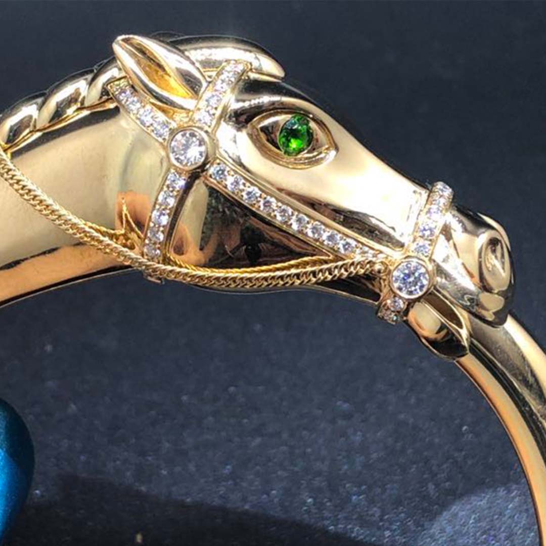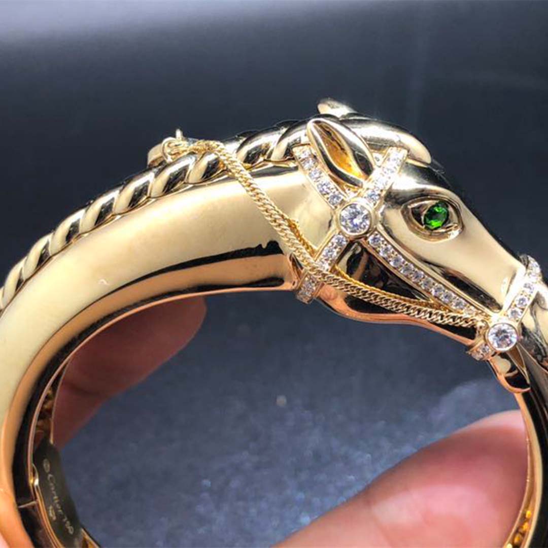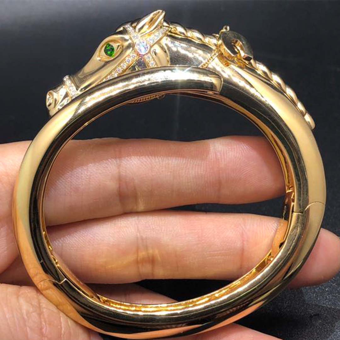 Do you love this Authentic Vintage Cartier 18K Yellow Gold Diamond Emeralds Horse Bangle Bracelet? Here at BeRealReal.com, we can do specially for you in amazing price. 100% mirror quality, real solid 18k gold and genuine diamonds guaranteed. Top workmanship and factory direct selling. Please inquire us via E-mail [email protected] or Whatsapp +1 (262)806-8175 for pricing.