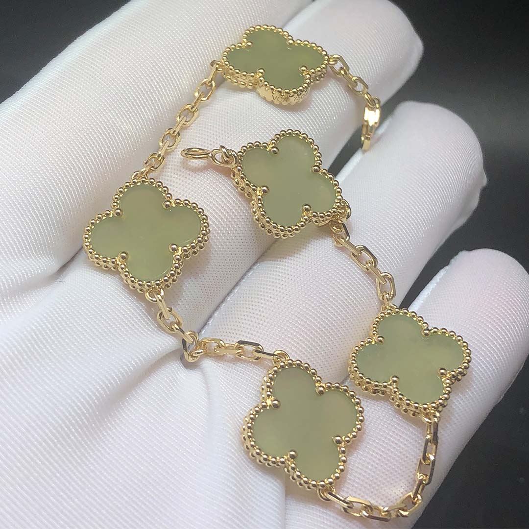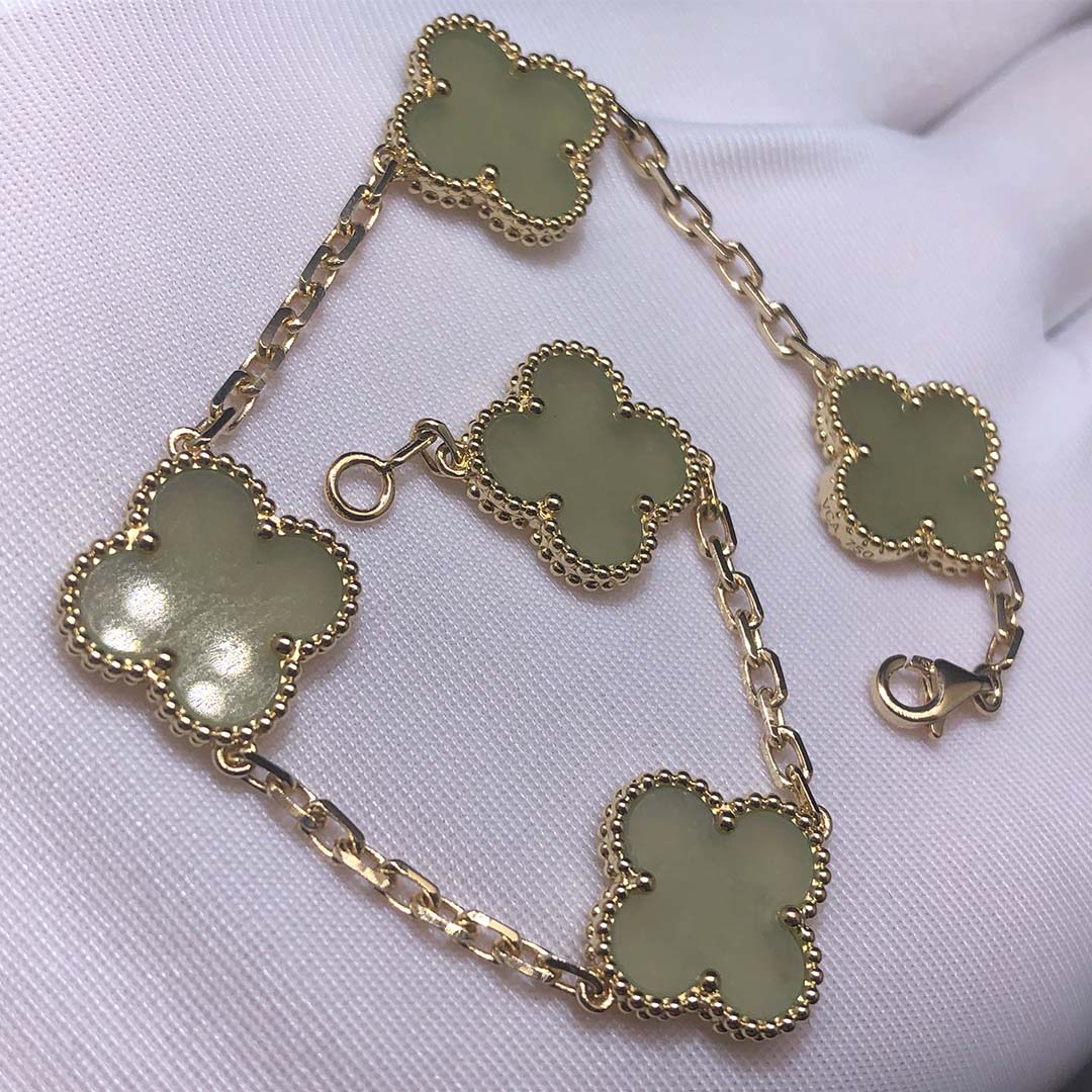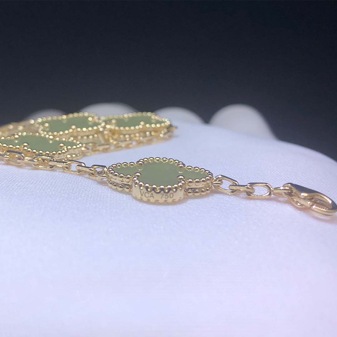 • Custom Van Cleef Arpels 18K Yellow Gold Vintage Alhambra Jade 5 Motifs Clover Bracelet