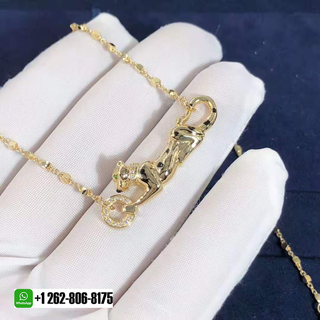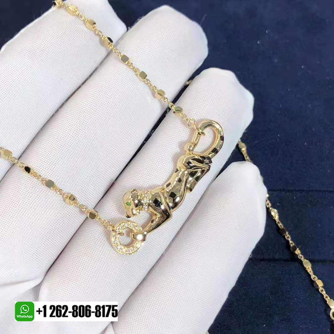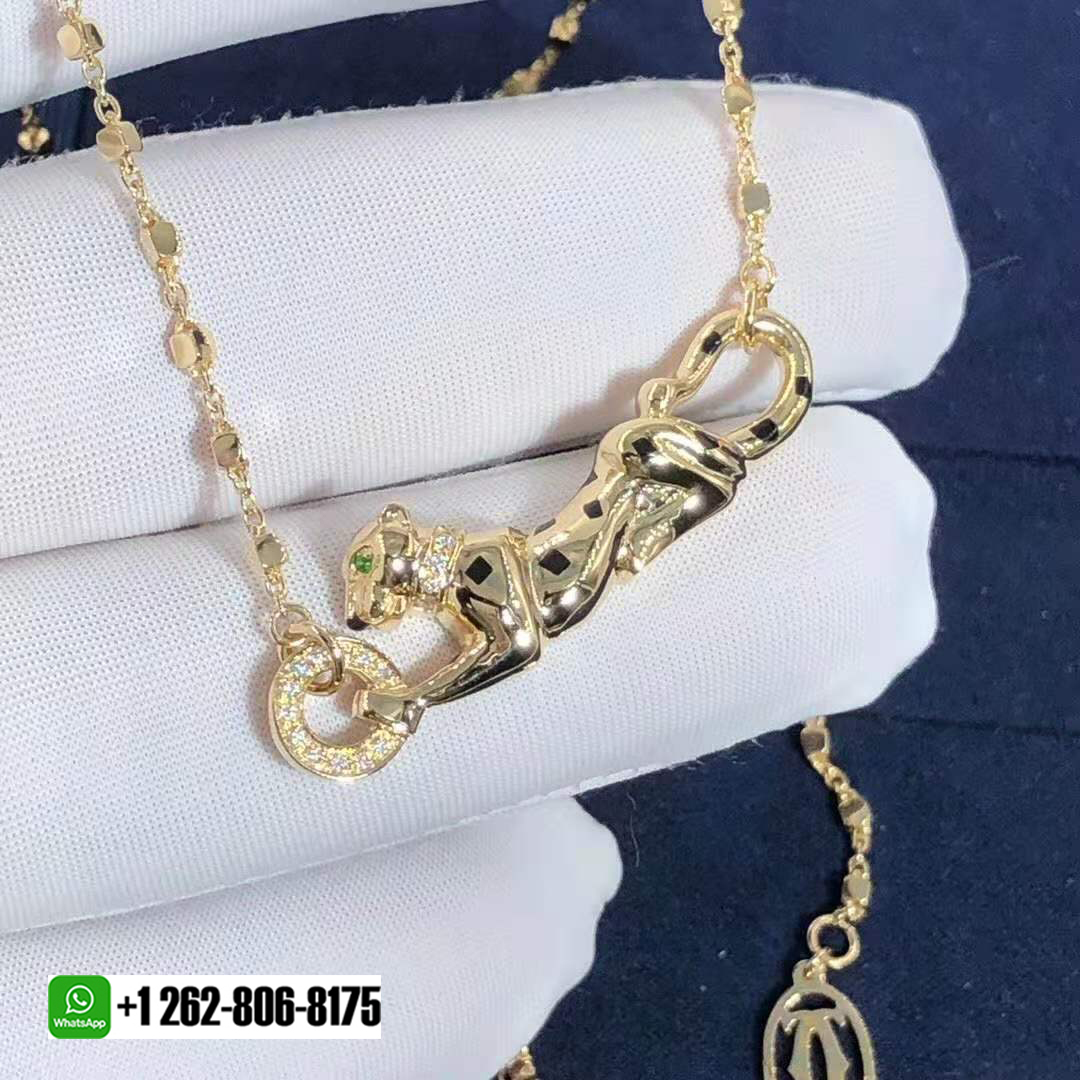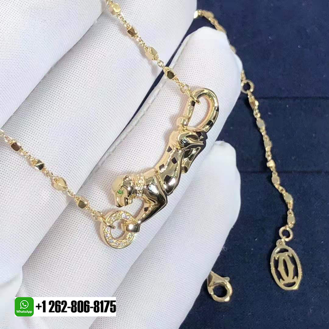 Panthère de Cartier necklace, 18K yellow gold, black lacquer, set with one tsavorite garnet and 19 brilliant-cut diamonds totalling 0.07 carats.