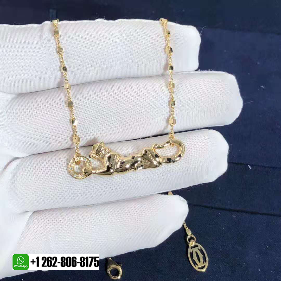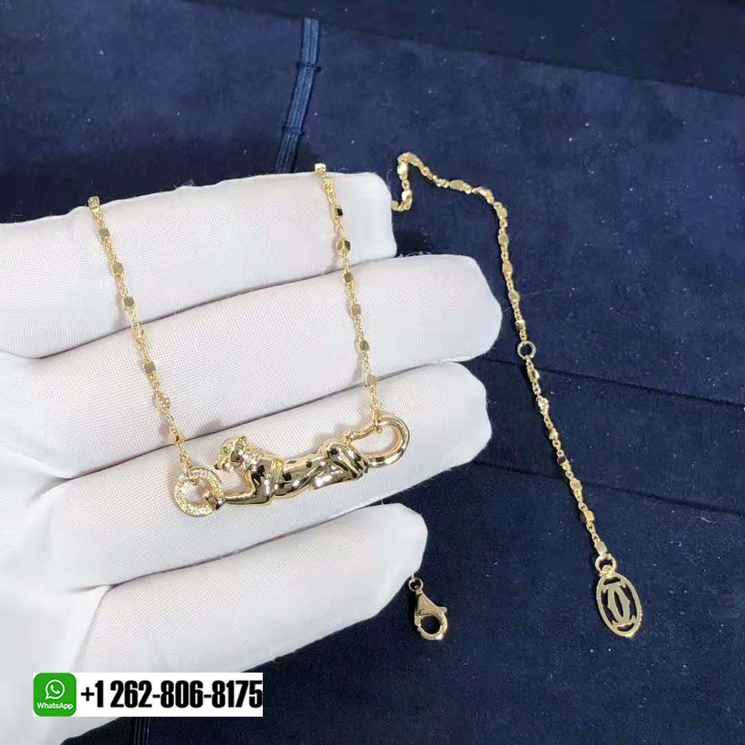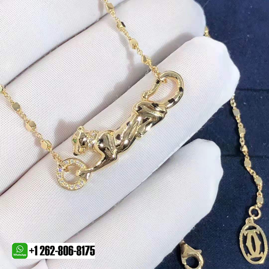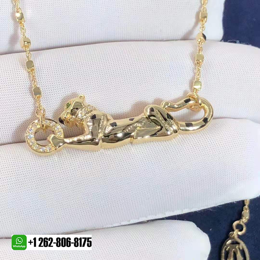 Panthère de Cartier necklace, 18K yellow gold, black lacquer, set with one tsavorite garnet and 19 brilliant-cut diamonds totalling 0.07 carats.