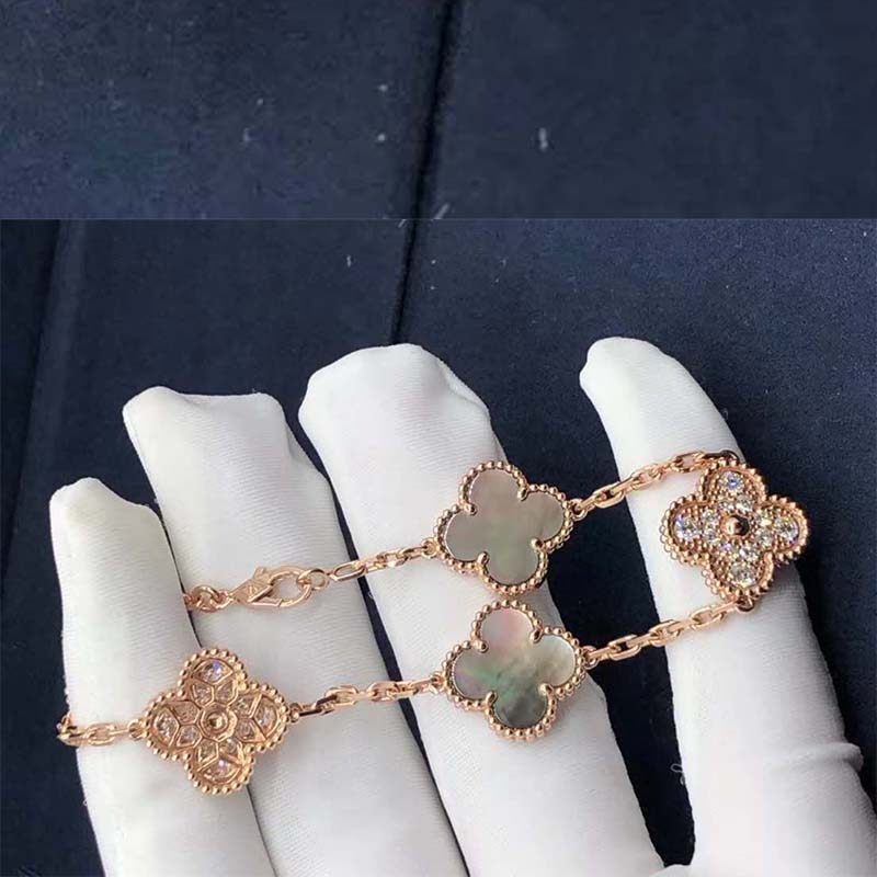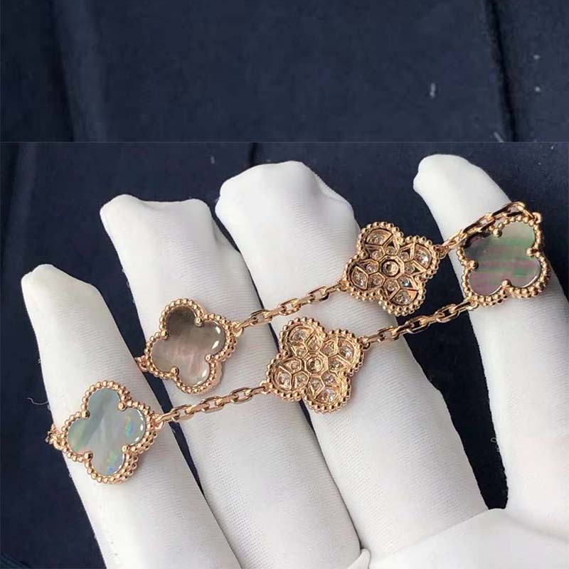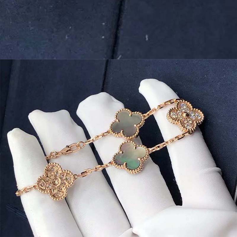 Vintage Alhambra bracelet, 5 motifs, rose gold, gray mother-of-pearl, round diamonds; diamond quality DEF, IF to VVS.