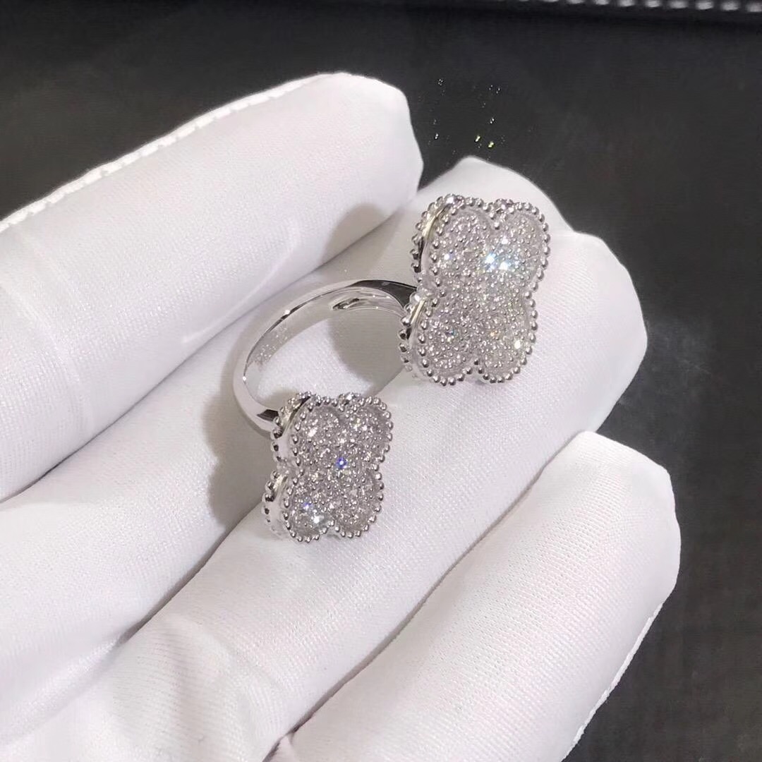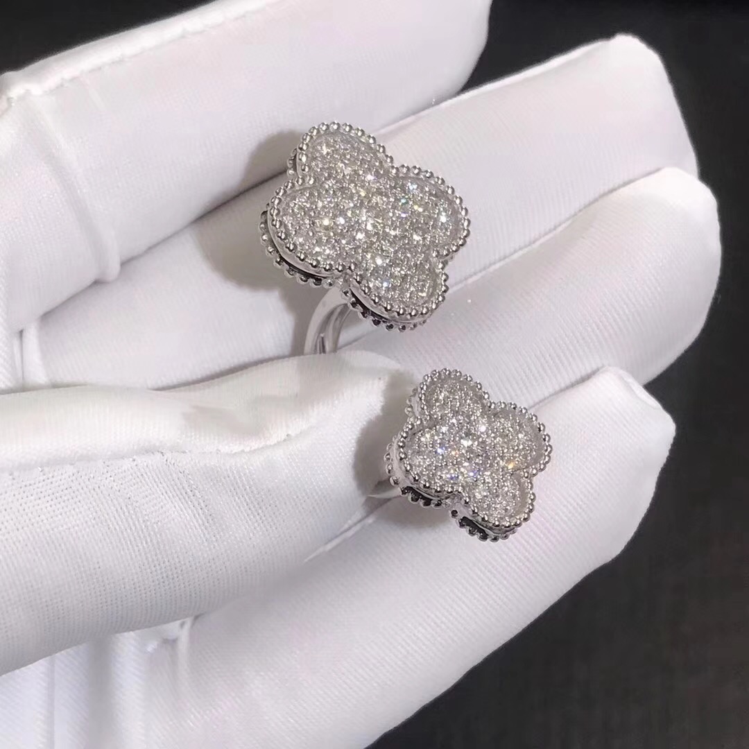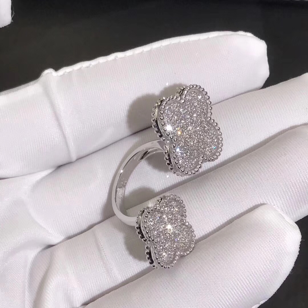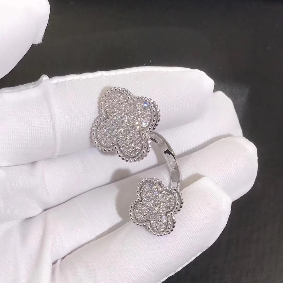 Van Cleef & Arpels Magic Alhambra Between the Finger Ring set in White Gold with Diamonds Handcrafted ladies Jewelry, luxury, casual jewelry, French Design. Founded in 1896 By Alfred Van Cleef and Salomon Arpels in Paris France.