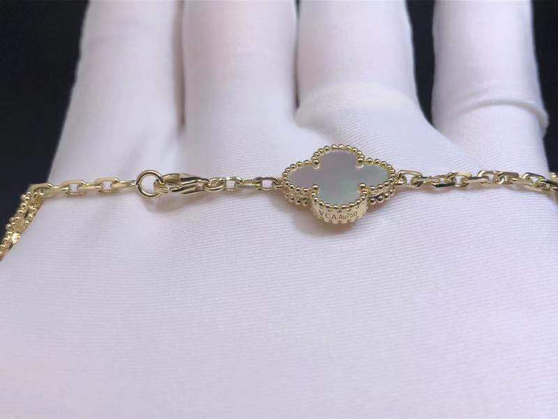 An 18k yellow gold necklace from the Vintage Alhambra collection by Van Cleef & Arpels. The necklace features 20 iconic 4 leaf clover motifs, each set with a beaded edge and a mother of pearl inlay, set throughout the length of the chain. The trace link necklace measures 84cm in length and has a lobster clasp fitting.
