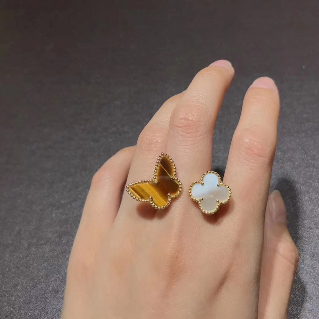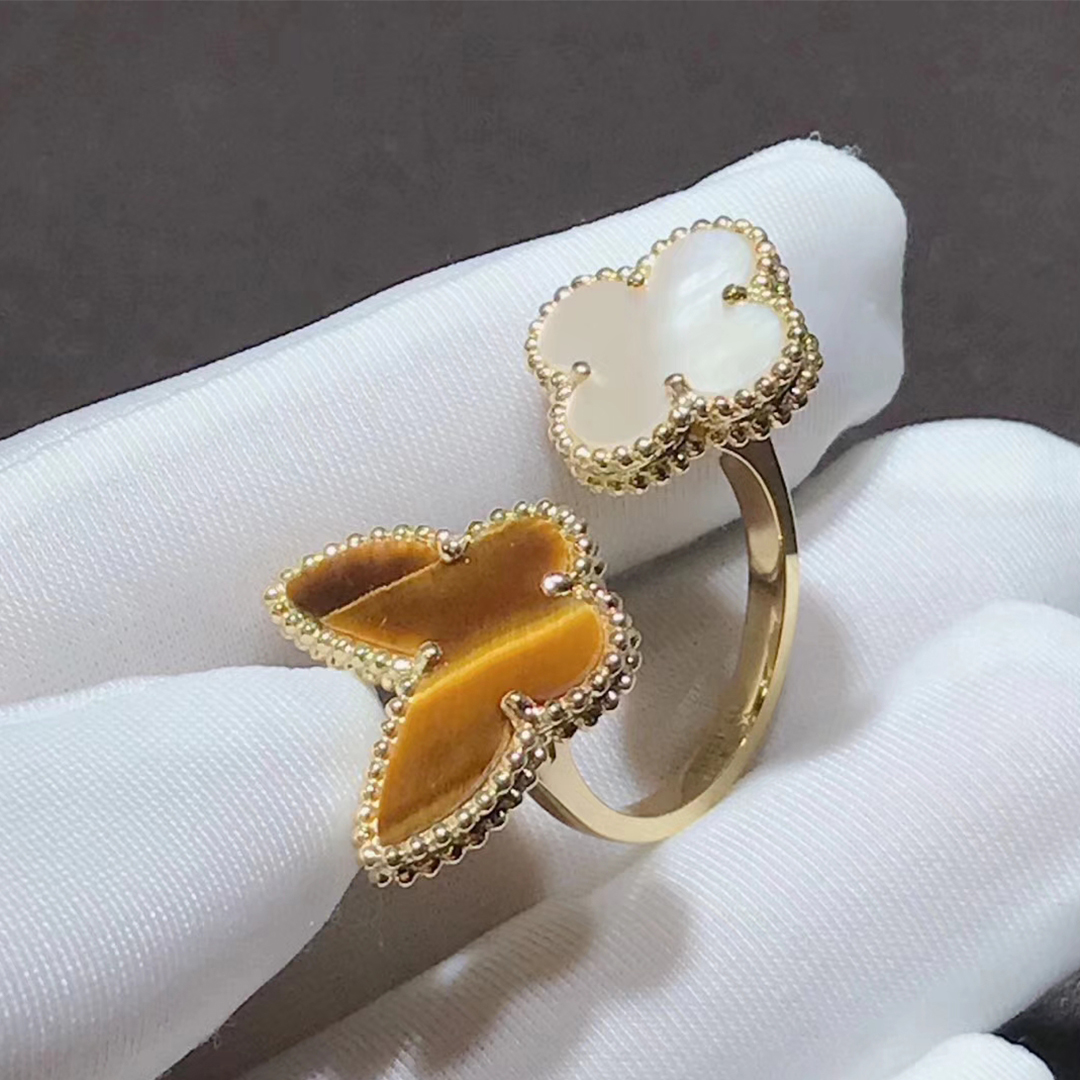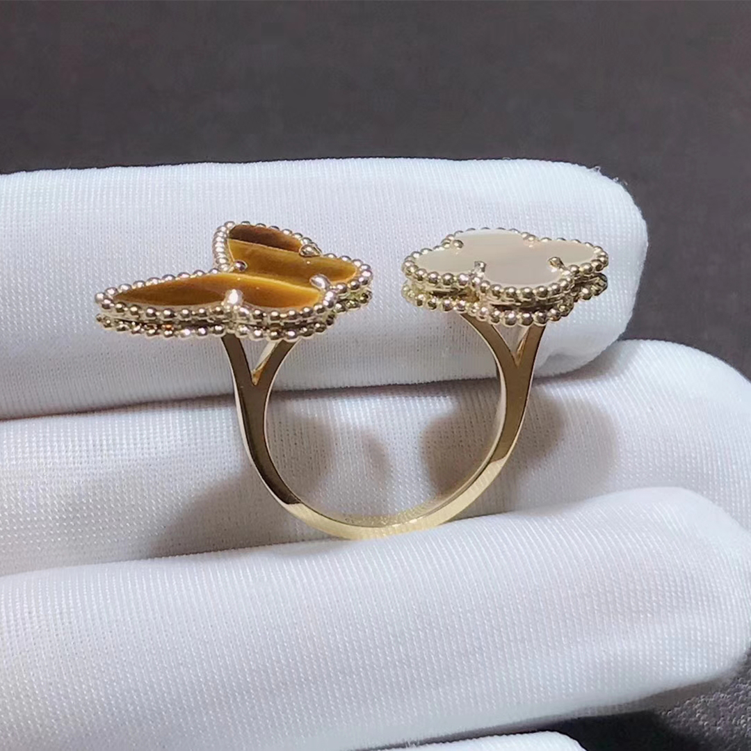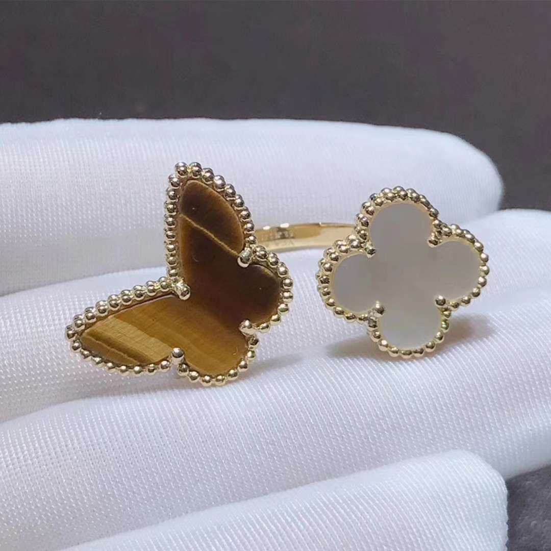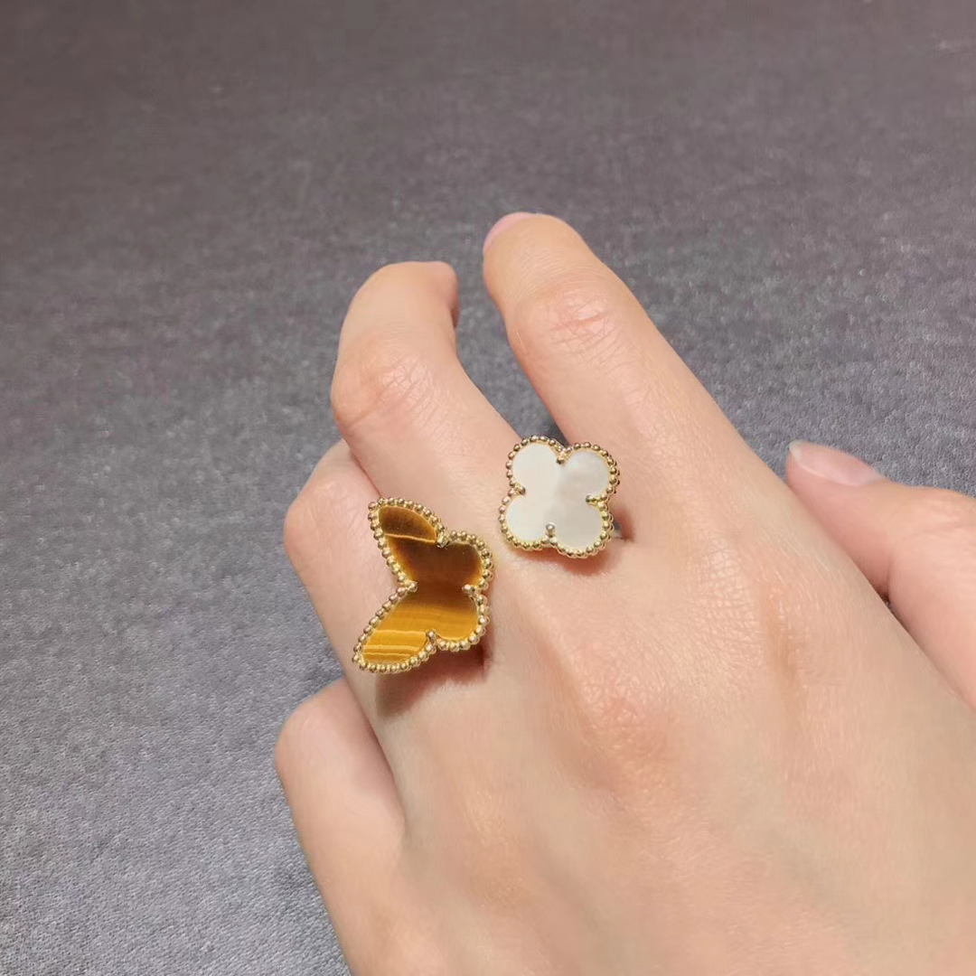 This stunning and unique ring from Van Cleef & Arpels features and 18k gold butterfly made of Tiger’s Eye and a smaller mother-of-pearl clover. From the Lucky Alhambra collection which draws inspiration from nature, this line features symbols of love and luck. This is a gorgeous piece that will become a cherished part of your jewelry collection for years to come.